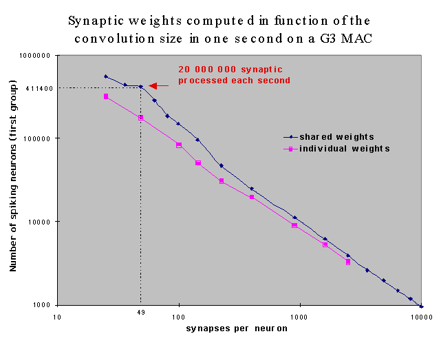 When we tested rigorously the performaces of SpikeNET in 1999, SpikeNET could compute roughly 20 million connections per second on a standard deckstop computer (Macintosh Power PC 233 Mhz). As shown in the next figure, this is sufficient to model a network of 400 000 neurons in real time, using a time step of 1 ms (assuming 49 connections per neuron, and an average firing rate of 1 spike per second, a value which is a reasonable estimate for the average firing rate of cortical neurons). Note that time resolution increses has virtually no effect on the computation time, and that adding a decay parameter to neurons adds roughly 30-40% to the computation time. Because of the type of processing performed by SpikeNET, we would expect this figures to scale with the processing power of new deckstop computers: for a Pentium 4 at 2 GHz for instance, the Software may be able to update about 100-200 million connections per second. You may find more detailed specification of this model in the paper section .