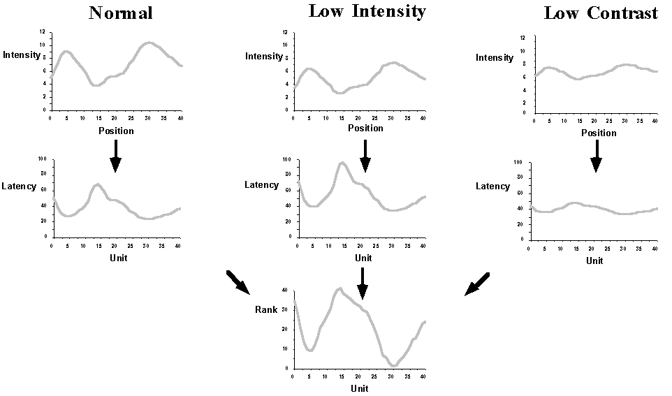 Invariance of Rank Order Coding to stimuli contrast changes. The three graphs on the left illustrate how an input intensity profile can be converted first into a latency profile across 40 units, and then into a rank profile. The center and right-hand panels show that changes in either intensity (center) or contrast (right) will have no effect on the rank ordering of the units, although latencies will change. |